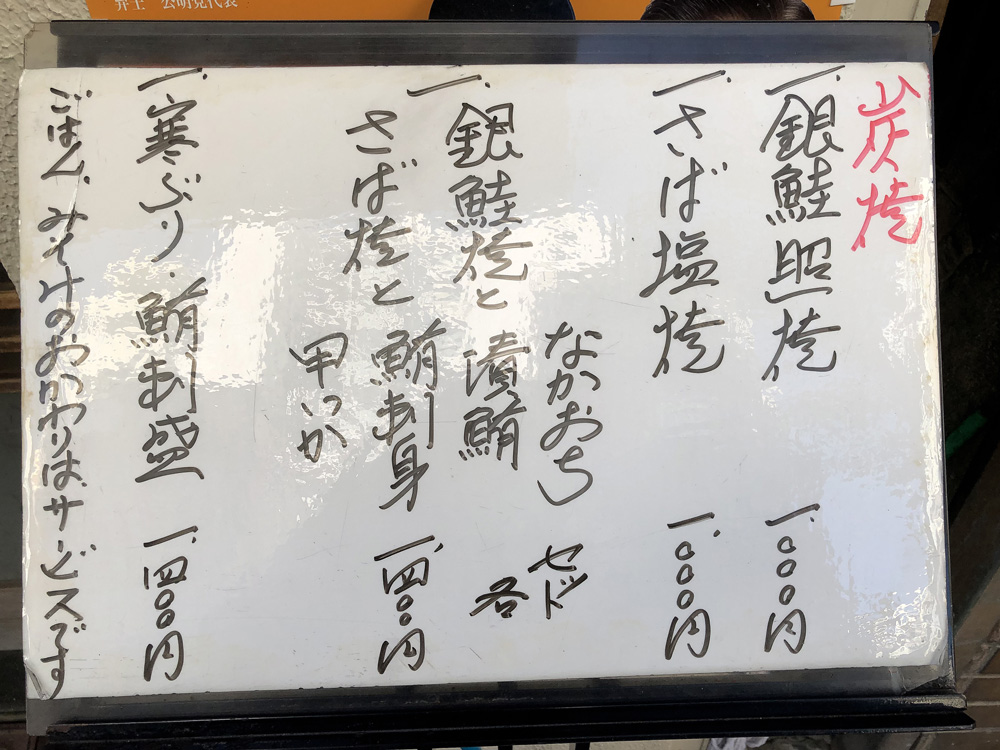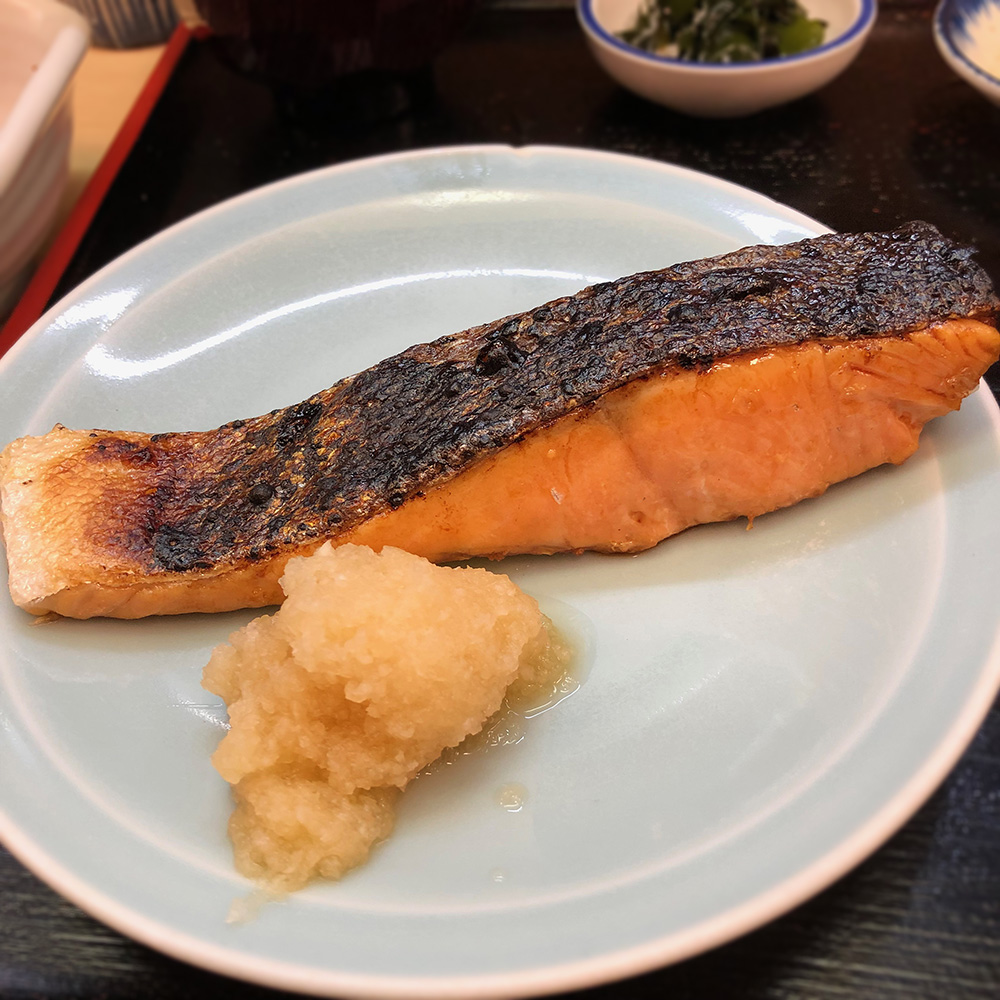 艷やかでプリっとした銀鮭を大きく箸で取り分け頬張るとじゅわっと旨味が口内に広がる。ご飯によく合うんだなぁ。味噌汁は豆腐と玉ねぎのシンプルなれど奥深い味わく実においしい。ご飯と味噌汁をお代わりして(味噌汁の具になめこが追加される心配りもうれしい)、こってりとした漬鮪でもう一膳。