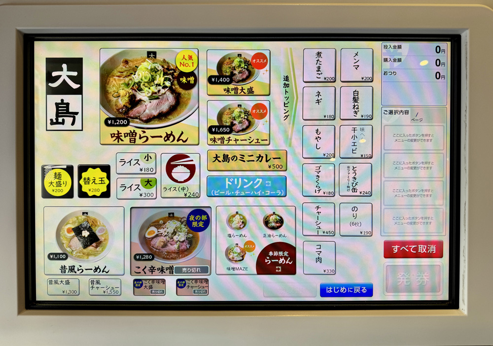 約2年ぶりで変わったといえば、券売機。そしてお値段。味噌チャーシューにするとちょっと勇気がいるようになっていたのにびっくり。味噌ラーメンが@790だったのが10年前の話。がんこの10年前は@700(今は@1,200)だから同じようなものだろう。それでも、味が変わらないで欲しいのがファンの願い。
