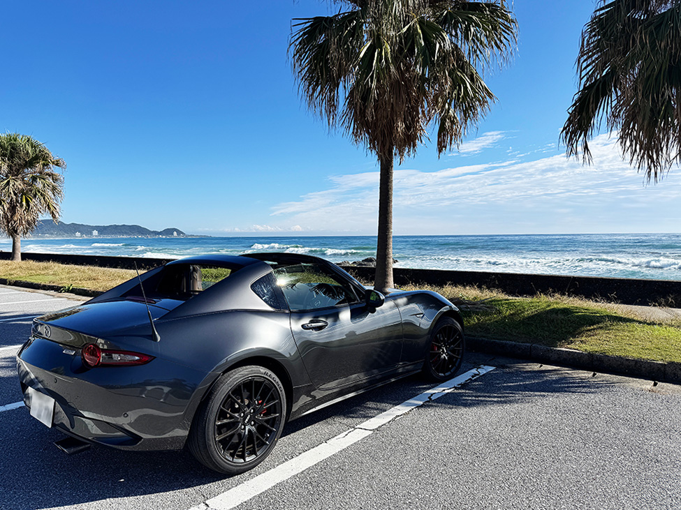 RFをオープンにして海岸通りをのんびりとクルージング。なんとも言えない開放感。海の匂い、潮風、波の音、煌めく海。歩いてすぐ、ちょっとドライブしてすぐ。人気のない初冬の海は穏やかで、日頃の喧騒を忘れさせてくれる。