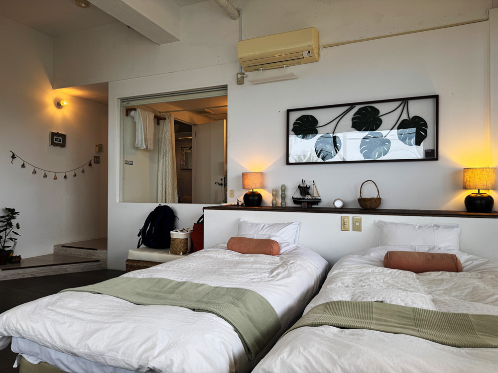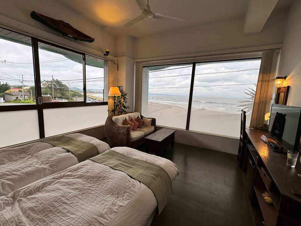 久しぶりに千倉に行くのなら一泊したよね、と探したのが千倉海岸を目の前にするホテル。1Fは香ばしい香りのするインド系カフェ、2Fがホテルで3Fより上は居住スペース。目の前の道は何度も通っていたけど泊まるのは初めて。