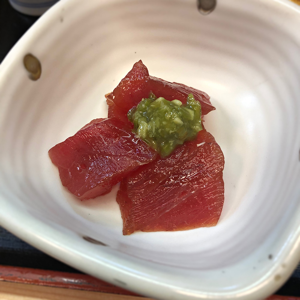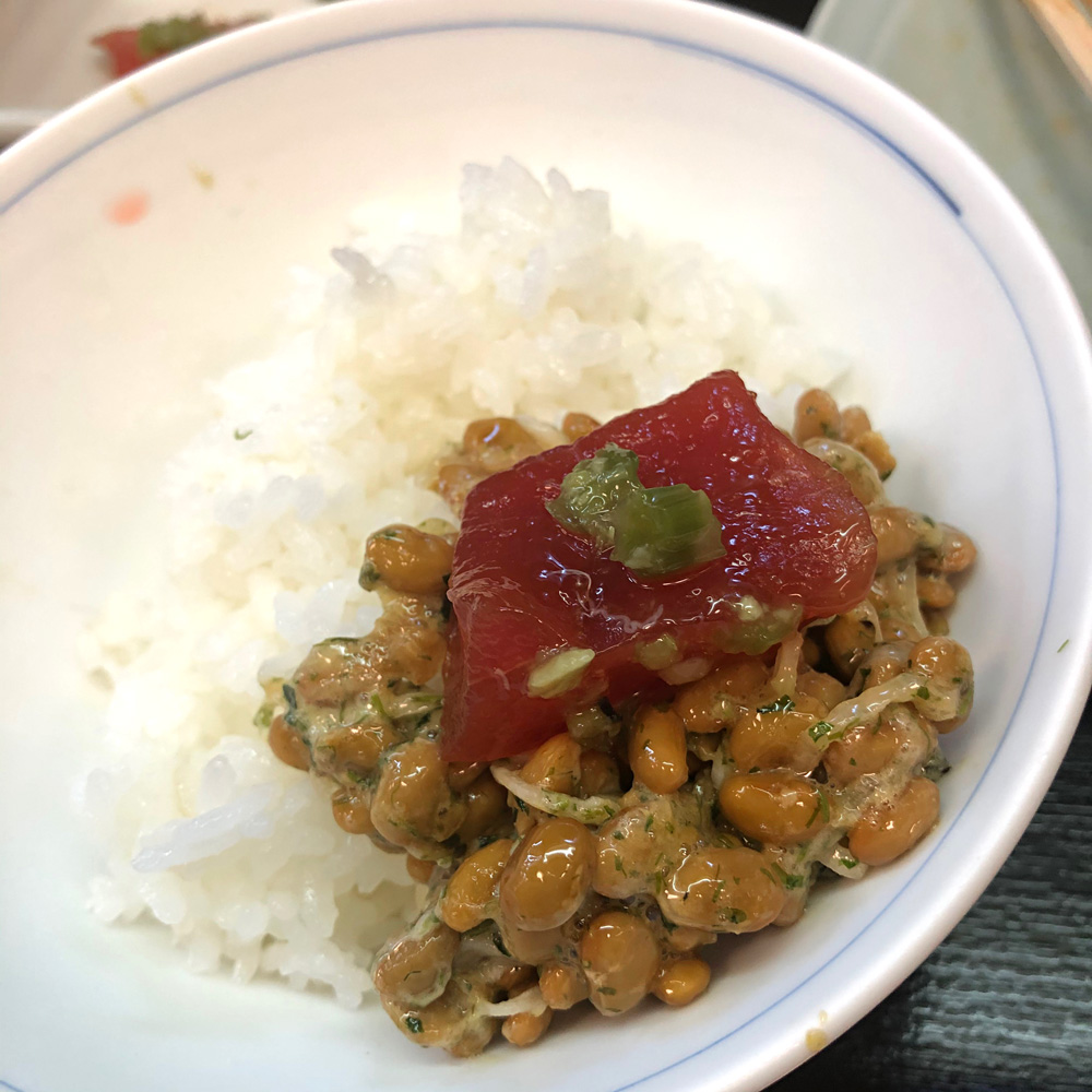 ご飯は、まず銀鮭だけで食べておみおつけと共におかわり。追加でお願いした納豆を熱々のご飯の上にのせ、合わせて漬けまぐろものせてハフハフ。なんという贅沢。