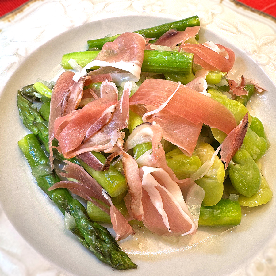 たっぷりの蟹あんをのせた具の入らない茶碗蒸し(彩が春っぽい)、うすいえんどうの卵とじ、そら豆アスパラ生ハムのサラダ。春の食材を組み合わせて春を感じる。これでおいしい日本酒があれば、心の通う話が尽きない夜。