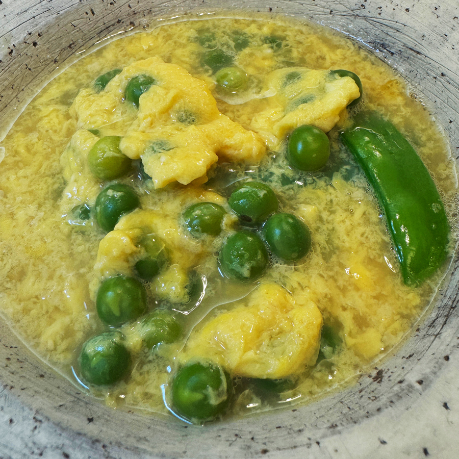 茶碗蒸しは丼に出汁でといた卵を入れ30分蒸すのが我が家では新しい作り方で有元葉子さんのレシピ。1回めは手間取ったけど、2回目以降はコツが分かりすっかり我が家の定番。うすいえんどうは主に関西で食されているグリンピースの品種改良されたもので青臭さが少ない。