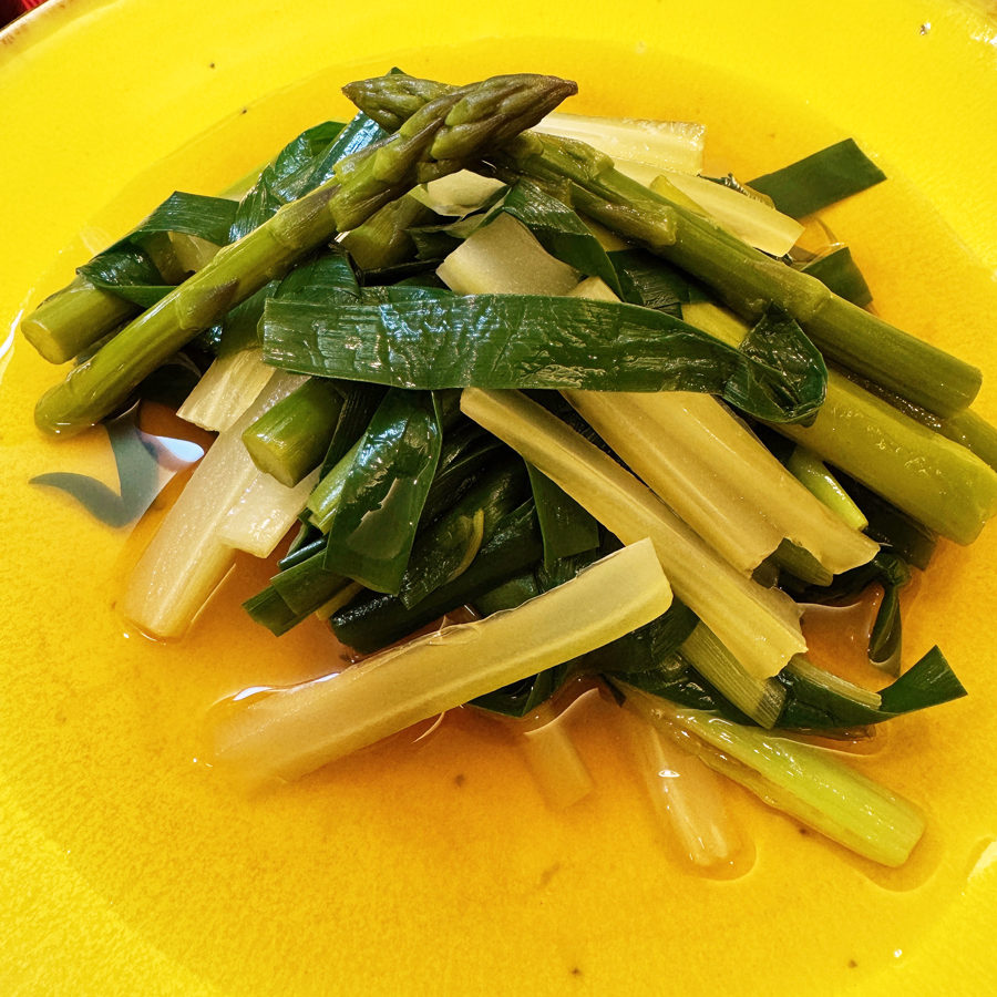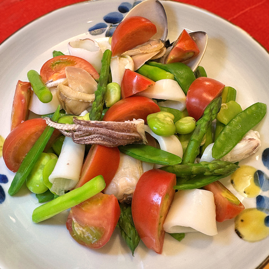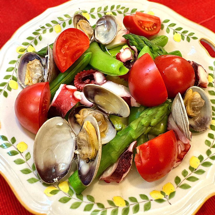 ハマグリ、ヤリイカ、アスパラ、フルーツトマト、そら豆。アサリ、タコ、アスパラ、フルーツトマト、スナップエンドウ。これらに、ベランダでもしゃもしゃ生えている山椒の葉をペーストし、酢味噌で和えたソースを付けると、なんとまぁおいしく春らしさを満喫。今年は急に暑くはならず、心地いい日と肌寒い日が繰り返されているように、春が長いような気がする。